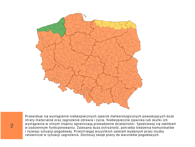 Jak informuje IMGW, alert drugiego stopnia oznacza, że przewiduje się wystąpienie zagrożenia dla zdrowia i życia. Mogą występować niebezpieczne zjawiska, których skutki mogą powodować zakłócenia w codziennym funkcjonowaniu. Zalecana jest duża ostrożność, śledzenie komunikatów i rozwoju sytuacji pogodowej. IMGW apeluje o przestrzeganie wszystkich zaleceń wydanych przez służby ratownicze w sytuacji zagrożenia.