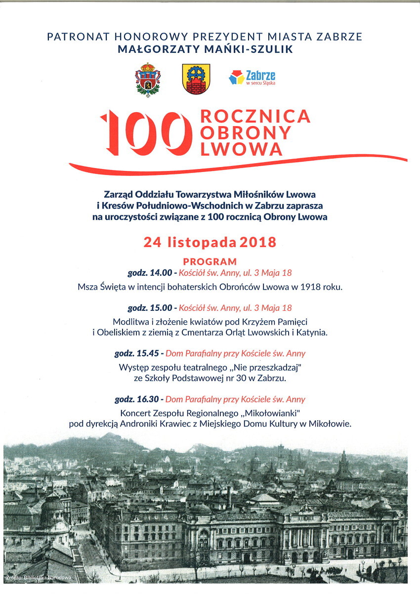 Zarząd Oddziału Towarzystwa Miłośników Lwowa i Kresów Południowo-Wschodnich w Zabrzu zaprasza na uroczystości związane z 100. rocznicą Obrony Lwowa, które odbędą się w naszym mieście 24 listopada.