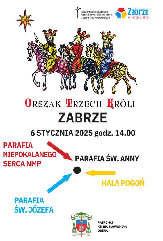 Orszak Trzech Króli w Zabrzu wyruszy o godz. 14:00. Mieszkańcy, pod przewodnictwem Kacpra, Melchiora i Baltazara, będą poruszać się z trzech różnych punktów w mieście. Czerwona grupa rozpocznie swój marsz przed kościołem pw. św. Kamila, niebieska przed kościołem pw. św. Józefa, a żółta grupa wyruszy z Hali Pogoń. Wszystkie grupy spotkają się przed kościołem pw. św. Anny, gdzie na mieszkańców czeka Zabrzańskie Betlejem.