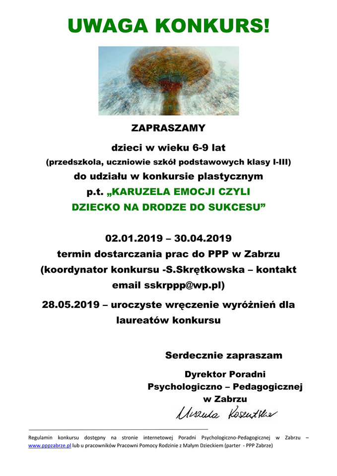 "Karuzela emocji czyli dziecko na drodze do sukcesu", to tytuł konkursu plastycznego, do udziału w którym zaprasza Poradnia Psychologiczno-Pedagogiczna w Zabrzu.