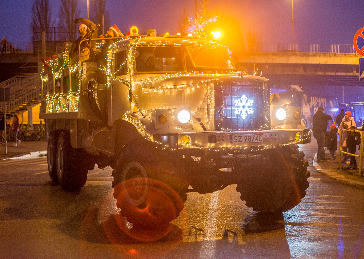 Przybyli na miejsce mogli podziwiać między innymi ogromnego KRAZA, wojskowe pojazdy terenowe, wozy bojowe straży pożarnej, a także radiowozy policji i straży miejskiej oraz ich wyposażenie. Na wielu pojazdach przesiadywały elfy Mikołaja, wystrojone w zielono-czerwone stroje, część przerobiono na platformy i ozdobiono lampkami, a przy pojazdach maszerowały dzielnie mażoretki Carnall Zabrze, które po 17 zaprezentowały autorski program. Fundacjo Militarnego Mikołaja - w pas się kłaniamy, piękna akcja.