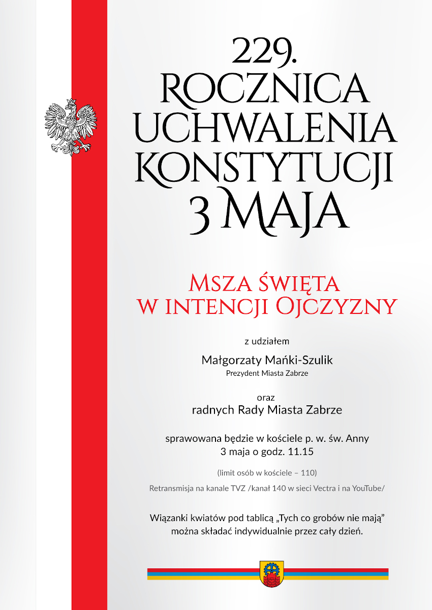Zapraszamy na obchody 229. rocznicy uchwalenia Konstytucji 3 Maja. W rocznicę uchwalenia Konstytucji 3 Maja, w kościele św. Anny w Zabrzu, o godz. 11.15, odprawiona zostanie msza św. w intencji Ojczyzny. Tagi:obchody