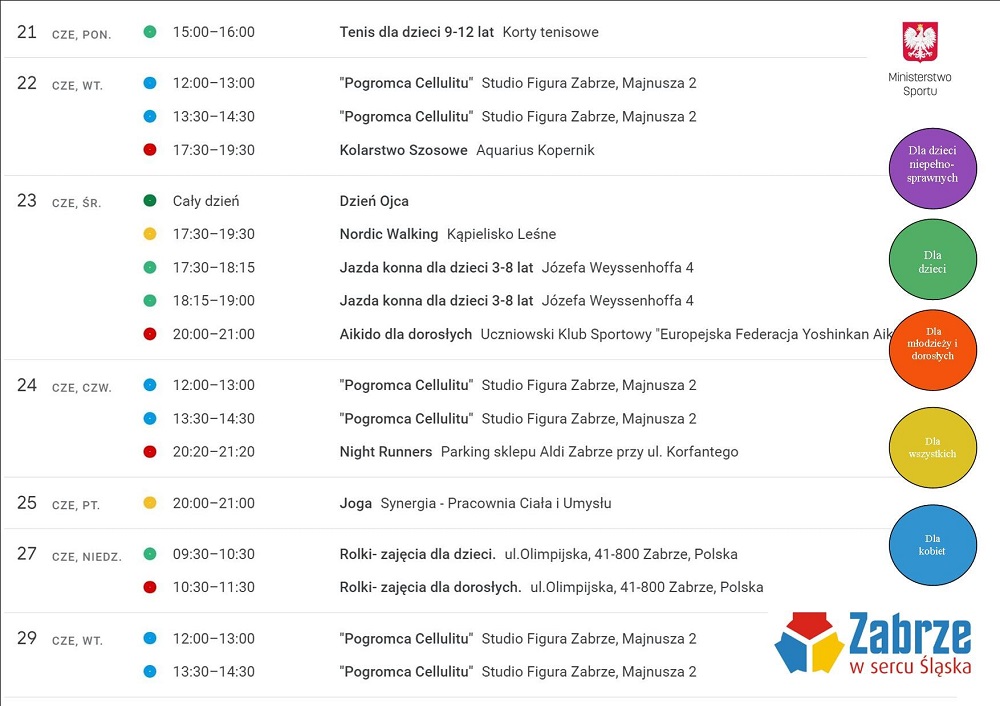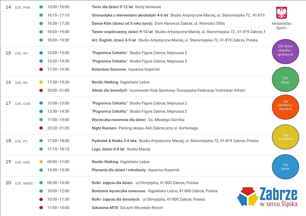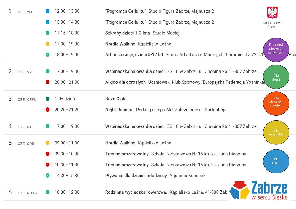 Zapraszamy do udziału w czerwcowych zajęciach “Aktywnego Zabrza”. Jak co miesiąc każdy znajdzie tu coś dla siebie. Najmłodsi mają do wyboru m.in. wspinaczkę halową, tenis, czy zajęcia taneczne. Dla starszych przygotowano ofertę, w której znajdą m.in. kolarstwo szosowe, jogę czy nordic walking.