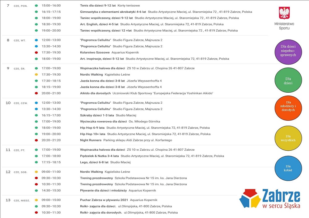 Aktywne Zabrze to program bezpłatnych zajęć sportowych dla mieszkańców Zabrza z trenerem lub instruktorem danej dyscypliny. Ze względu na sytuację epidemiczną wszystkie zajęcia odbywają się w obowiązującym reżimie sanitarnym.