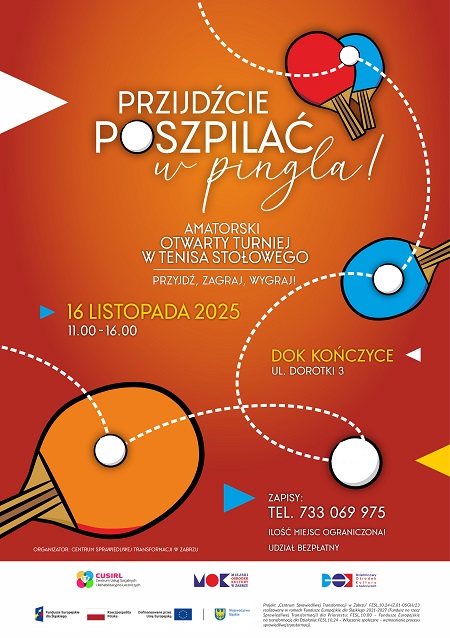 W Zabrzu-Kończycach odbędzie się otwarty amatorski turniej tenisa stołowego „Przijdźcie poszpilać w pingla!”. Uczestnicy powalczą o nagrody, dyplomy i tytuł mistrza.