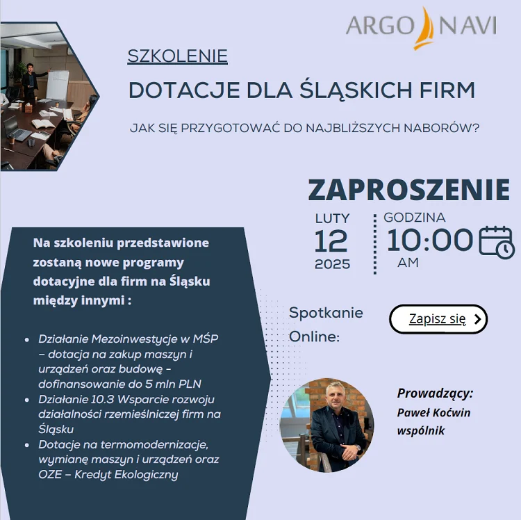 W związku ze zbliżającymi się nowymi naborami dotacyjnymi na inwestycje dla firm w woj. śląskim w roku 2025, firma Argo Navi.