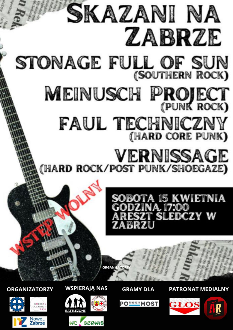 Ten areszt uwolni każdego, kto się w nim stawi. Wyzwoli w ludziach dobrą energię, obudzi zamiłowanie do sztuki, ruszy pokłady empatii. 15 kwietnia Rada Dzielnicy Śródmieście, Stowarzyszenie Nowe Zabrze oraz Kobiety w Centrumzapraszają na koncert w Areszcie Śledczym w Zabrzu. Zagrają Stonage Full of Sun, Faul Techniczny, Meinusch Project oraz Vernissage. Wstęp jest bezpłatny, ale cel charytatywny.