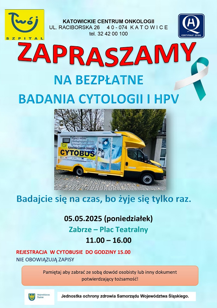W poniedziałek, 5 maja 2025 roku, na placu Teatralnym w Zabrzu ponownie zaparkuje CYTOBUS, mobilny punkt diagnostyczny oferujący bezpłatne badania cytologiczne oraz testy HPV.