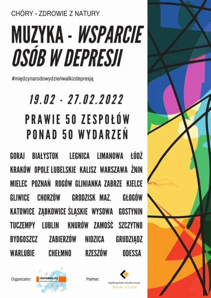 Akcja „Muzyka – wsparcie osób w depresji” organizowana jest przez fundację Chórtownia oraz Ogólnopolską Konferencję „Mam głos”. Akcja ma na celu propagowanie śpiewu chóralnego jako formy profilaktyki i wspomagania procesu wychodzenia z choroby. Równie ważnym działaniem jest szerzenie profesjonalnej wiedzy na temat depresji, dzięki wsparciu zaangażowanych psychologów i psychoterapeutów.