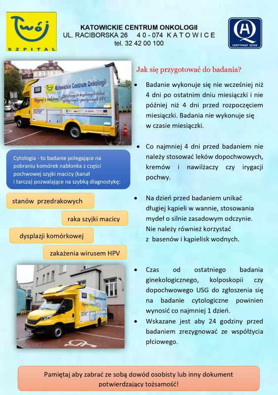 Do badania nie jest wymagana wcześniejsza rezerwacja, jednak należy pamiętać, że rejestracja w Cytobusie możliwa będzie tylko do godziny 15:00. Konieczne jest okazanie dowodu osobistego lub innego dokumentu potwierdzającego tożsamość.
