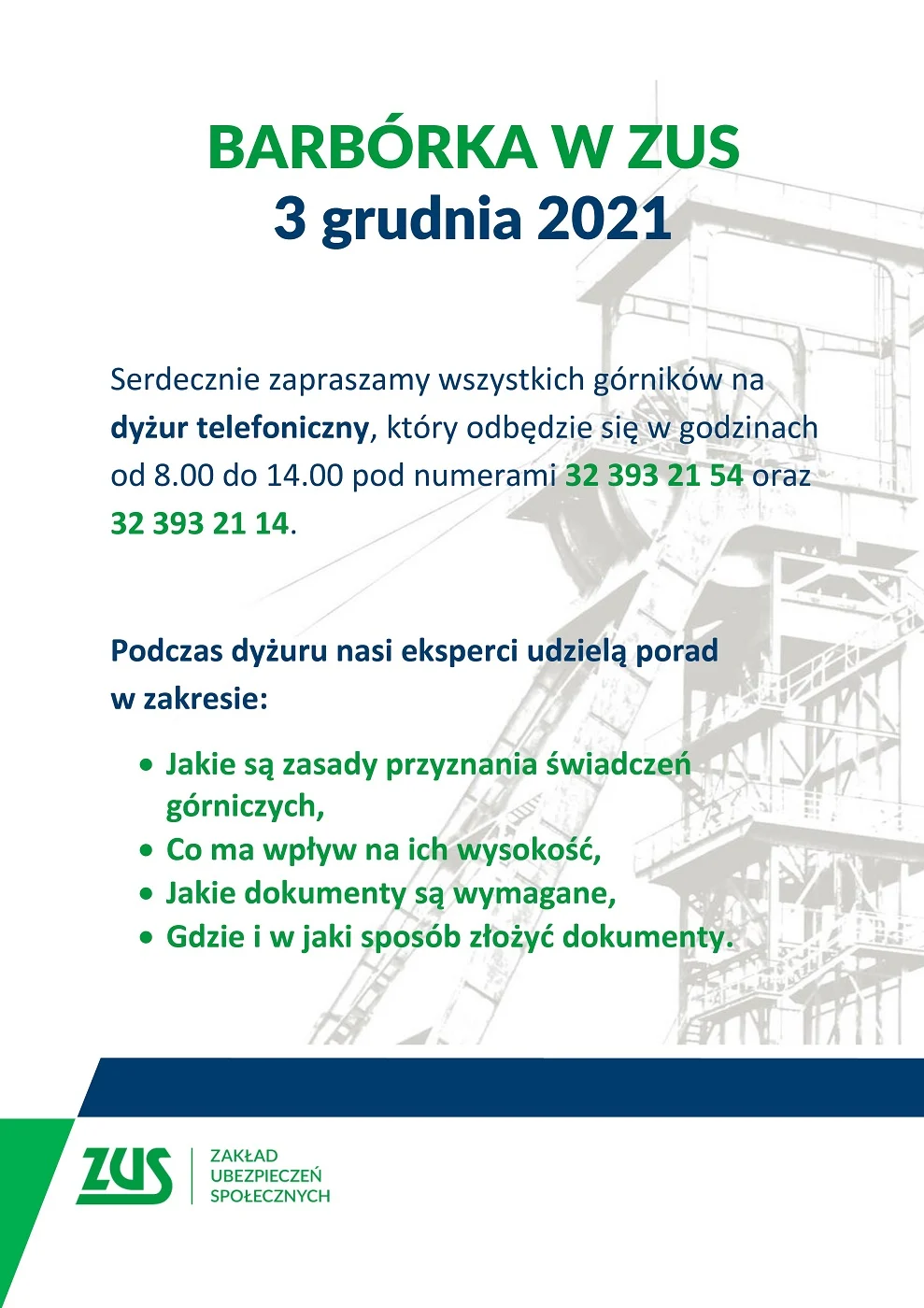 3 grudnia Oddział ZUS w Zabrzu organizuje dyżur telefoniczny dotyczący emerytur górniczych. Dzwonić można w godz. od 8:00 do 14:00 pod nr tel. 32 393 21 54 oraz 32 393 21 14.