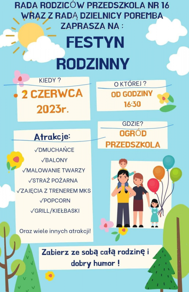 Zabawa dla całej rodziny odbędzie się także w ogrodzie Przedszkola nr 16 w Zabrzu. Rada Rodziców przedszkola wraz z Radą Dzielnicy Poremba organizuje Festyn Rodzinny, który rozpocznie się o godzinie 16.30. W programie: dmuchańce, balony, malowanie twarzy, brokatowe tatuaże, straż pożarna, zajęcia piłkarskie, przejażdżki konne oraz grill.