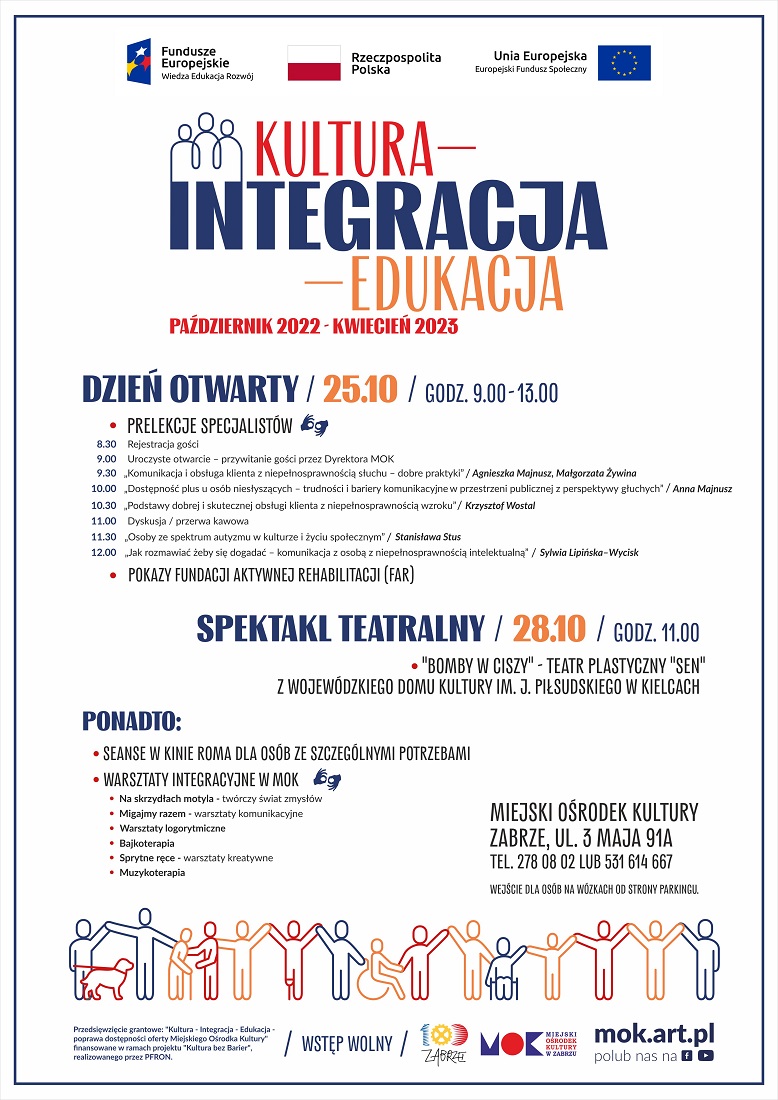 25 października w godzinach od 9:00 do 13:00 w zabrzańskim MOK odbędzie się w Dzień Otwarty, w ramach którego przewidziano prelekcje specjalistów, dyskusję oraz pokazy Fundacji Aktywnej Rehabilitacji (FAR), a także spektakl „Bomby w ciszy” w wykonaniu aktorów Teatru Plastycznego „Sen” z Wojewódzkiego Domu Kultury im. J. Piłsudskiego w Kielcach. Ponadto w Kinie ROMA zaplanowano również seanse filmowe dla osób ze szczególnymi potrzebami, a w MOK warsztaty integracyjne.