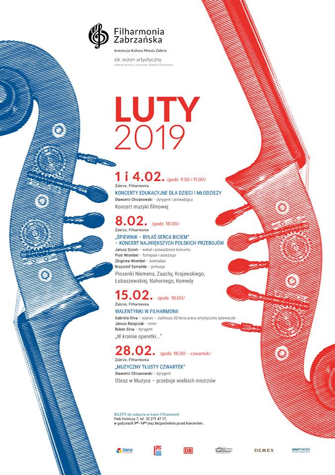 Pełen repertuar Filharmonii Zabrzańskiej zaplanowany na luty br. na plakacie poniżej.