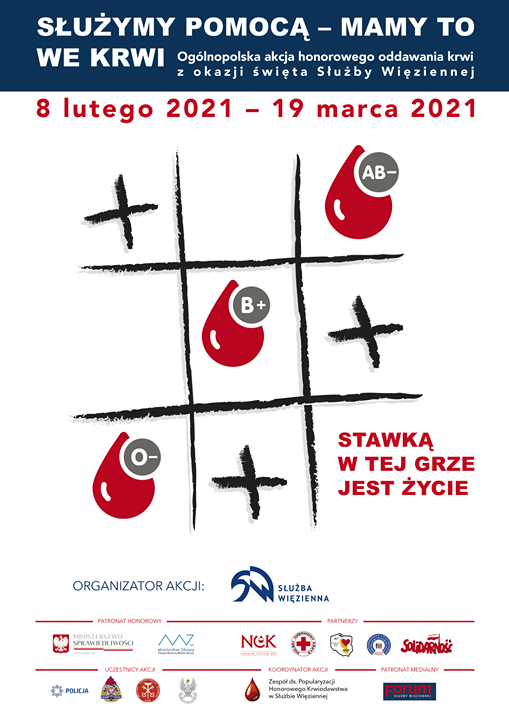 To motto tegorocznej, czwartej już edycji, ogólnopolskiej akcji honorowego oddawania krwi z okazji Święta Służby Więziennej “Służymy pomocą – Mamy to we krwi”. Funkcjonariusze i pracownicy Służby Więziennej oddawali krew od 8 lutego do 19 marca. Akcję honorowym patronatem objęło Ministerstwo Sprawiedliwości iMinisterstwo Zdrowia. Celem inicjatywy była pomoc w ratowaniu życia ludzkiego poprzez łagodzenie deficytu krwi w placówkach leczniczych oraz bankach krwi. Czas epidemii koronawirusa to czas wielkiego testu społecznej solidarności i odpowiedzialności. Pomoc oddających krew i osocze jest niezwykle potrzebna każdego dnia, by ratować osoby, które niejednokrotnie walczą o życie.