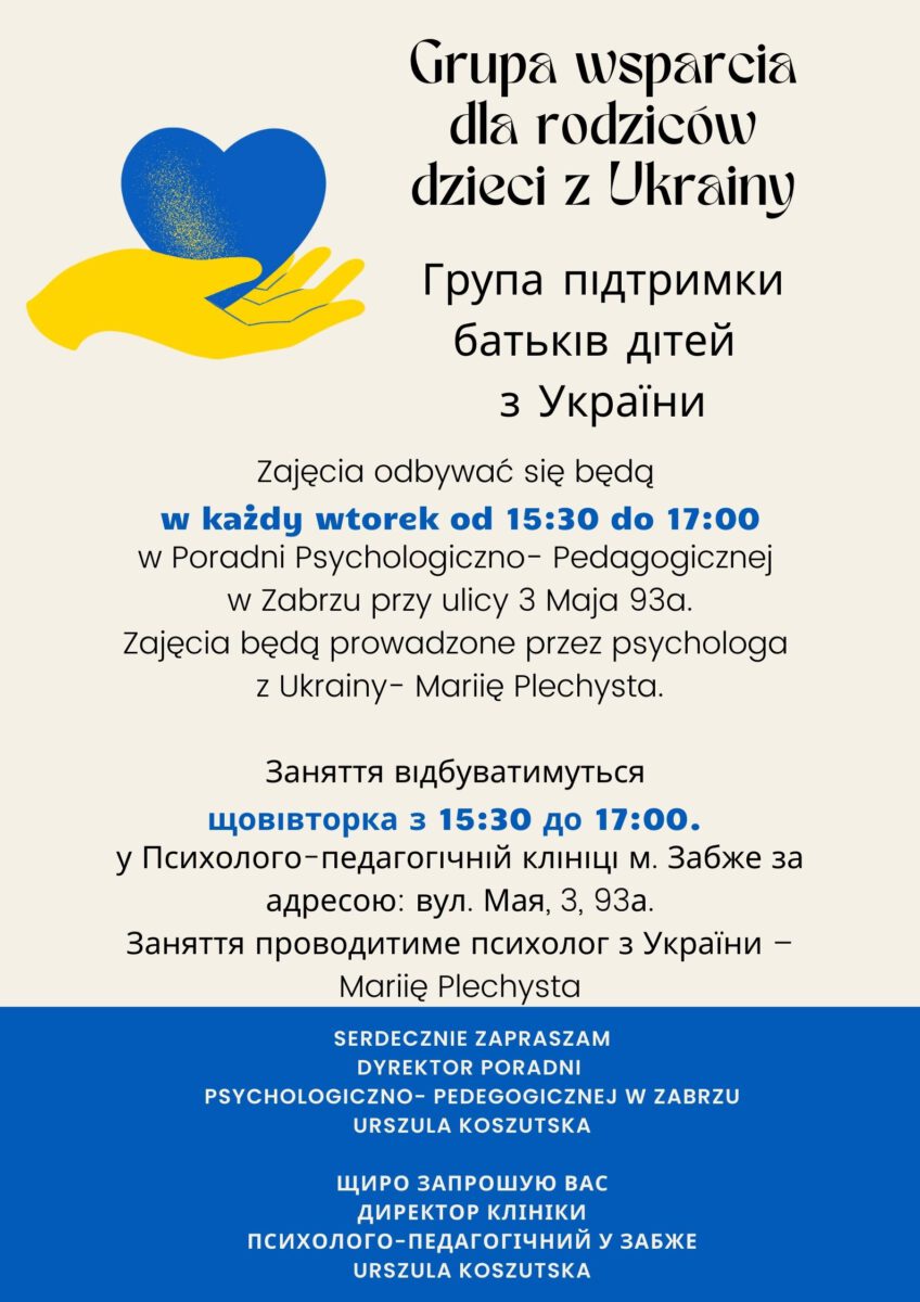 W związku z tym Poradnia Psychologiczno-Pedagogiczna w Zabrzu zaproponowała utworzenie grupy wsparcia dla rodziców dzieci z Ukrainy, przebywających na terenie miasta Zabrze.