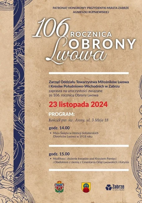 W najbliższą sobotę, 23 listopada, odbędą się w Zabrzu obchody 106. rocznicy obrony Lwowa, organizowane przez Zabrzański oddział Towarzystwa Miłośników Lwowa i Kresów Południowo-Wschodnich oraz Muzeum Górnictwa Węglowego. Wydarzenie objęła honorowym patronatem prezydentka Zabrza Agnieszka Rupniewska.