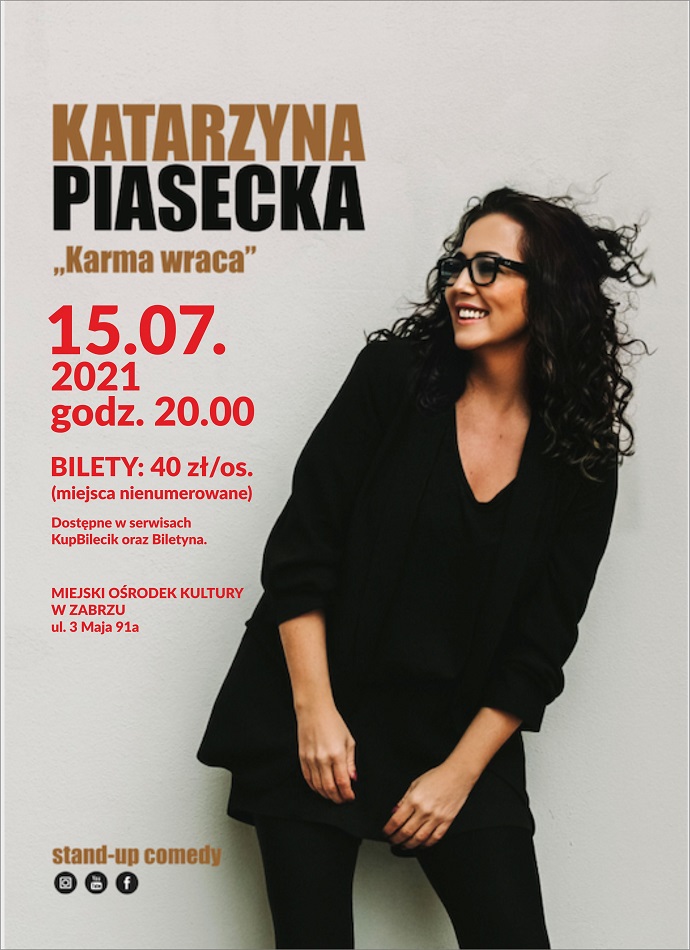 Katarzyna Piasecka wystąpi w Miejskim Ośrodku Kultury w Zabrzu w najnowszym programie stand-up comedy “KARMA WRACA”. Nowe historie, nowe spostrzeżenia i kawał śmiesznego programu. Wszystko w niezmiennie charyzmatycznej, bezpośredniej i bezkompromisowej formie. Podczas wieczoru wystąpi również support.