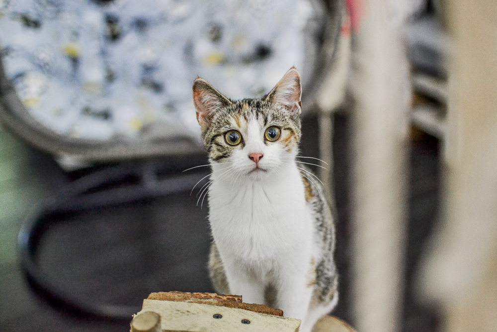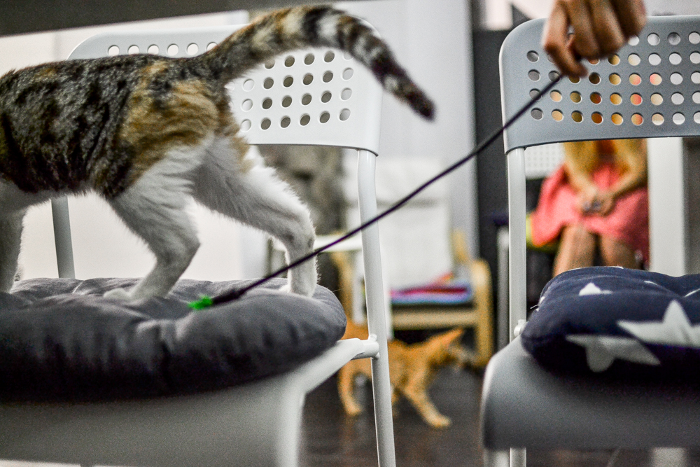 W lokalu mieszka obecnie kilka kotów, zarówno młodych, jak i dorosłych. Można je głaskać, obserwować i bawić się z nimi, pod warunkiem, że same tego chcą. Obsługa pilnuje, aby nikt ich nadmiernie nie zaczepiał, bo choć to one są magnesem na klientów, ich komfort jest najważniejszy. Nie ma się więc co dziwić, że czasami na sali przebywa kilka z nich, a czasami żaden, bo wolą pospać w części dedykowanej tylko im. Bywa, że ktoś z obsługi zwróci nam uwagę na niewłaściwe zachowanie.