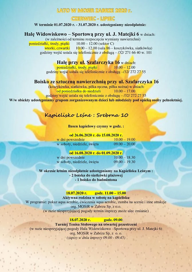 Z racji rozpoczynających się wakacji Miejski Ośrodek Sportu i Rekreacji przygotował mnóstwo atrakcji dla dzieci i młodzieży oraz dla wszystkich wczasowiczów, którzy wakacje spędzają w Zabrzu.