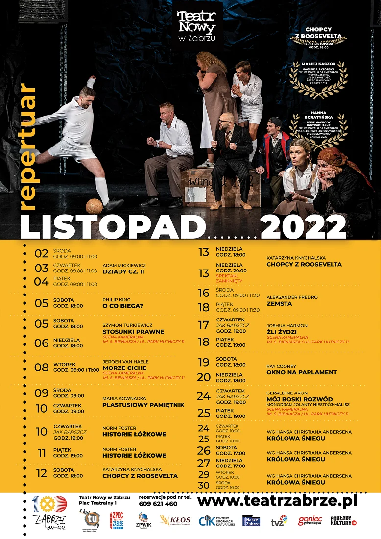 W listopadzie będziemy mogli się wybrać także m.in. na farsę „O co biega” Philipa Kinga, „Stosunki prawne” Szymona Turkiewicza, „Morze ciche” Jeroena van Haele, „Plastusiowy pamiętnik” Marii Kownackiej, „Chopców z Roosevelta” czy też „Królową Śniegu”.