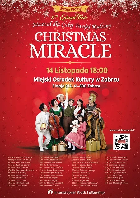 Już w piątek, 14 listopada 2025 r. o godz. 18:00, Zabrze zanurzy się w świątecznej magii dzięki wyjątkowemu musicalowi „Christmas Miracle”. Spektakl organizowany przez International Youth Fellowship Poland to emocjonalna, międzynarodowa produkcja, która łączy historię biblijną z opowieścią współczesną – o rodzinie, przebaczeniu i nadziei.