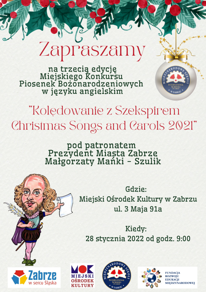 Urząd Miejski w Zabrzu zaprasza do udziału w trzeciej edycji Miejskiego Konkursu Piosenek Bożonarodzeniowych w języku angielskim pod hasłem „Kolędowanie z Szekspirem” Christmas Songs and Carols 2021. Honorowy patronat nad konkursem objęła prezydent Zabrza Małgorzata Mańka-Szulik.
