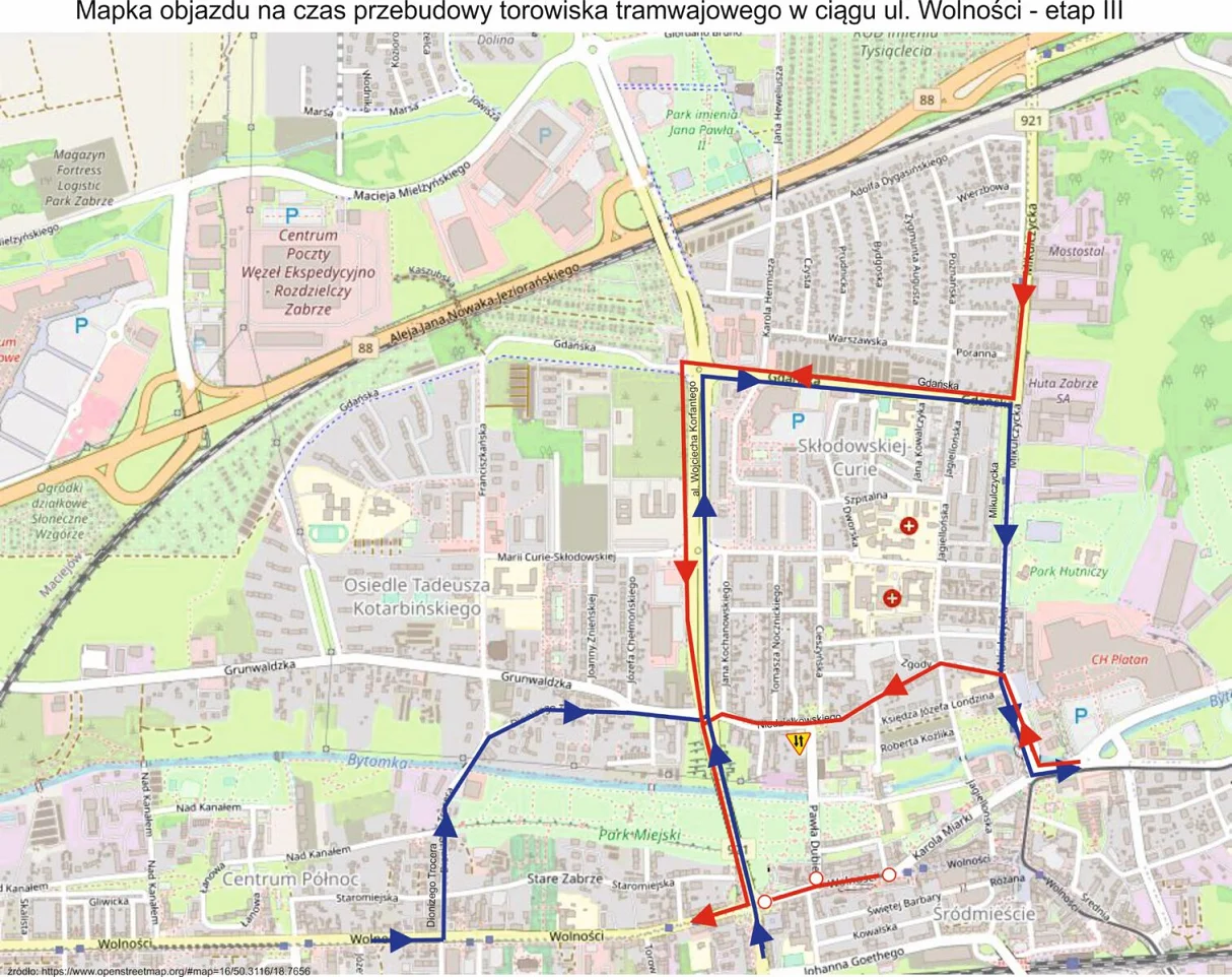 Modernizacja torowiska w ciągu ulicy Wolności w centrum Zabrza wkracza w trzeci etap. W związku z tym już dziś, 10 sierpnia wyłączony z ruchu został odcinek w/w ulicy na odcinku od skrzyżowania z ul. Dubiela do skrzyżowania z ul. Gen. de Gaulle’a. Rozszerzenie dotychczasowego obszaru objętego robotami będzie skutkowało wyłączeniem ruchu za wyjątkiem ruchu pojazdów zaopatrujących zlokalizowane na tym odcinku drogi placówki handlowe.