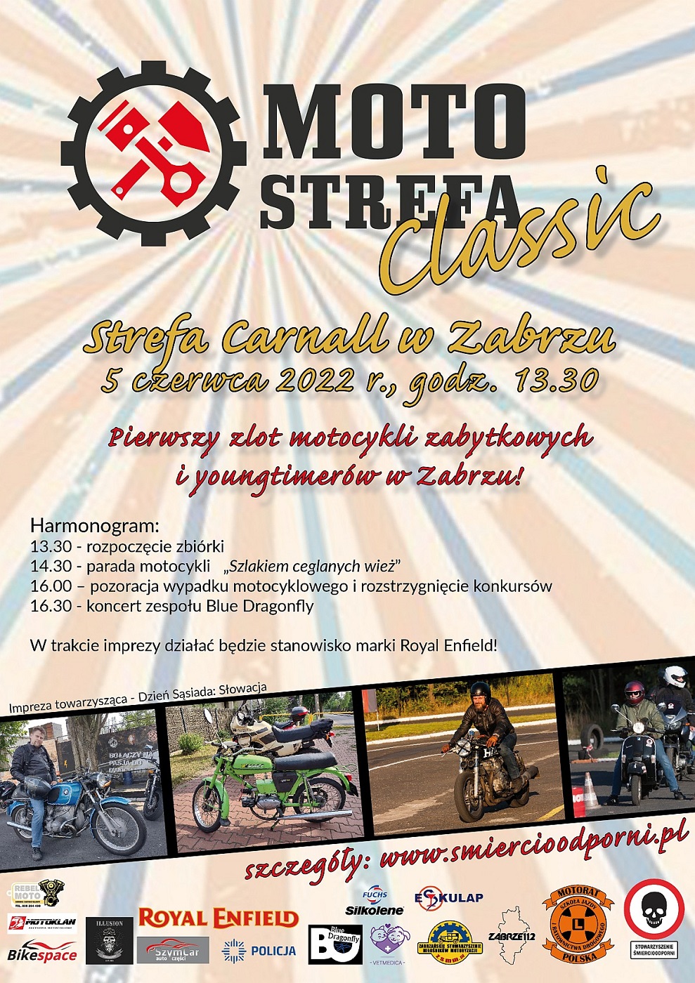 W niedzielę 5 czerwca na terenie Strefy Carnall (przy ul. Wolności 408) odbędzie się impreza motocyklowa MotoStrefa Classic. Będzie to pierwszy w historii Zabrza zlot motocykli zabytkowych, motocyklowych youngtimerów oraz customów, czyli głęboko przerobionych motocykli! Głównym organizatorem jest Stowarzyszenie Śmiercioodporni.