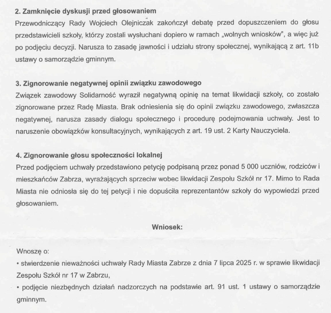 W dokumencie piszą między innymi o tym, że przy procedowaniu uchwały naruszono kilka przepisów prawa oraz postępowania uchwałodawczego..