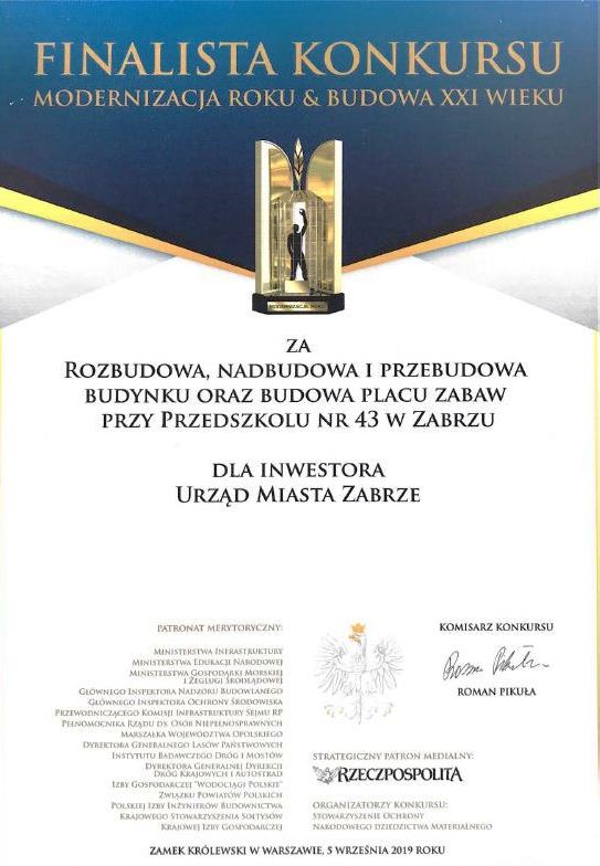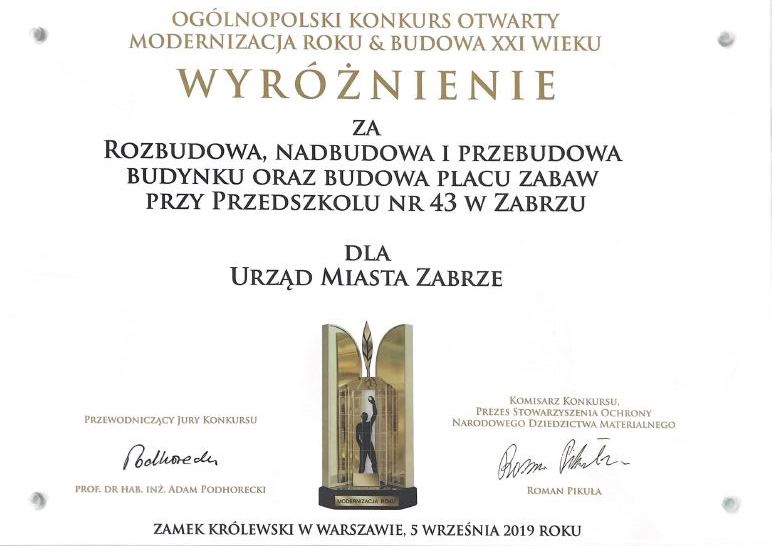 Przedszkole nr 43 w Zabrzu zdobyło wyróżnienie w XXIII edycji Ogólnopolskiego Konkursu Modernizacja Roku & Budowa XXI w.