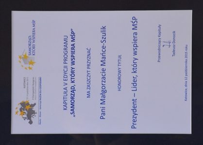 Ogólnopolski program „Samorząd, który wspiera MŚP”, realizowany przez Regionalną Izbę Gospodarczą w Katowicach, jest przedsięwzięciem towarzyszącym Europejskiemu Kongresowi Małych i Średnich Przedsiębiorstw. Program jest skierowany do jednostek samorządu terytorialnego szczebla wojewódzkiego, powiatowego i lokalnego. Celem programu jest wyłonienie i promocja samorządów, które stwarzają przedsiębiorstwom sektora MŚP dogodne warunki do prowadzenia działalności gospodarczej oraz w szczególny sposób wspierają rozwój tego sektora. Znalezienie się w gronie Laureatów Programu to nie tylko wzmocnienie wizerunku Urzędu w otoczeniu, ale także potwierdzenie szczególnej dbałości o rozwój sektora MŚP. Otrzymanie tak prestiżowego tytułu z rąk środowisk biznesowych jest wyraźnym sygnałem na to, iż podejmowane działania w zakresie wspierania MŚP są skuteczne i mają charakter trwały.
