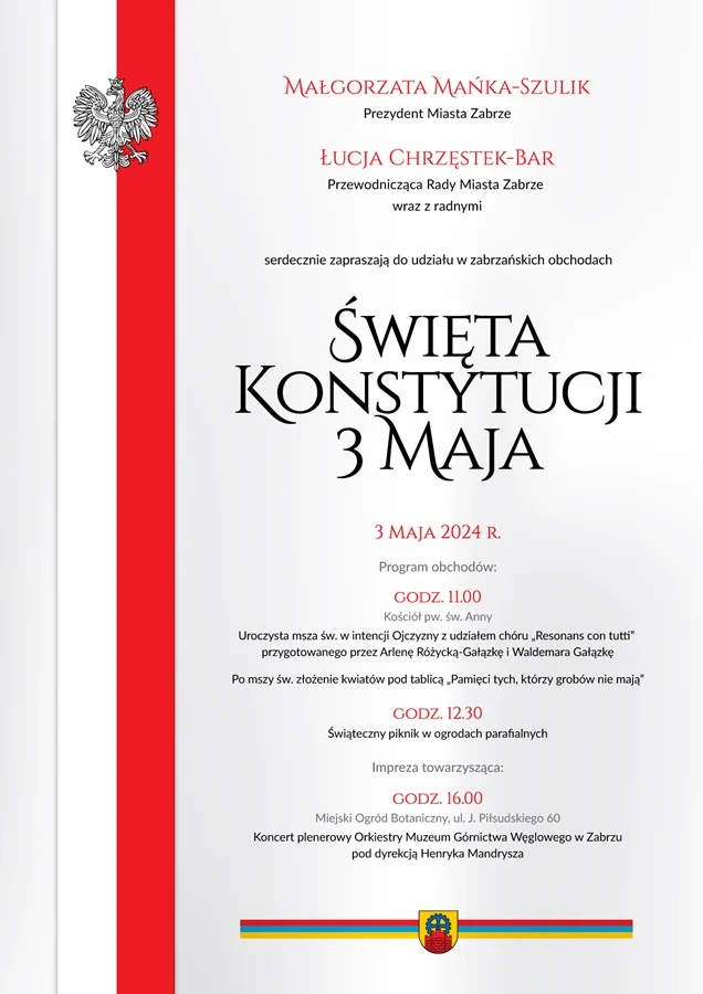 Prezydent Zabrza Małgorzata Mańka-Szulik oraz przewodnicząca Rady Miasta Zabrze Łucja Chrzęstek-Bar wraz z radnymi zapraszają do udziału w zabrzańskich obchodach Narodowego Święta Konstytucji, których punktem kulminacyjnym będzie uroczysta msza św. w intencji Ojczyzny, odprawiona w Kościele pw. św. Anny w środę, 3 maja, o godz. 11.00.