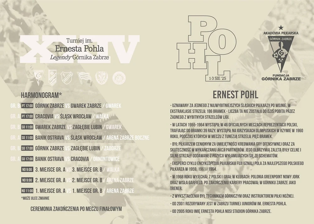 Turniej im. Ernesta Pohla to wyjątkowe wydarzenie, które ma na celu upamiętnienie legendarnego piłkarza Górnika Zabrze, który osiągnął wiele sukcesów, w tym osiem mistrzostw Polski z Górnikiem Zabrze oraz rekord 187 bramek ligowych. Ernest Pohl był również mentorem młodszych piłkarzy, w tym Włodzimierza Lubańskiego, który jest patronem turnieju.