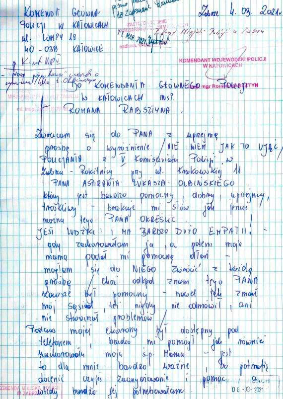 Policyjna służba to nie tylko ściganie przestępców, czy wystawianie mandatów za wykroczenia – to pomoc potrzebującym w wielu różnych sytuacjach. Odręcznie napisany list z wyrazami wdzięczności trafił do Komendanta Wojewódzkiego Policji w Katowicach insp. Romana Rabsztyna.
