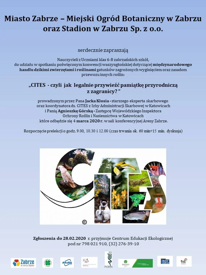 Miasto Zabrze, Miejski Ogród Botaniczny w Zabrzu oraz Stadion w Zabrzu Sp. z o.o. zapraszają nauczycieli z uczniami klas 6-8 zabrzańskich szkół do udziału w spotkaniu poświęconym konwencji waszyngtońskiej dotyczącej międzynarodowego handlu dzikimi zwierzetami i roślinami gatunków zagrożonych wyginięciem oraz zasadom przewozu innych roślin – „Cites – czyli jak legalnie przywieźć pamiątkę przyrodniczą z zagranicy?”.