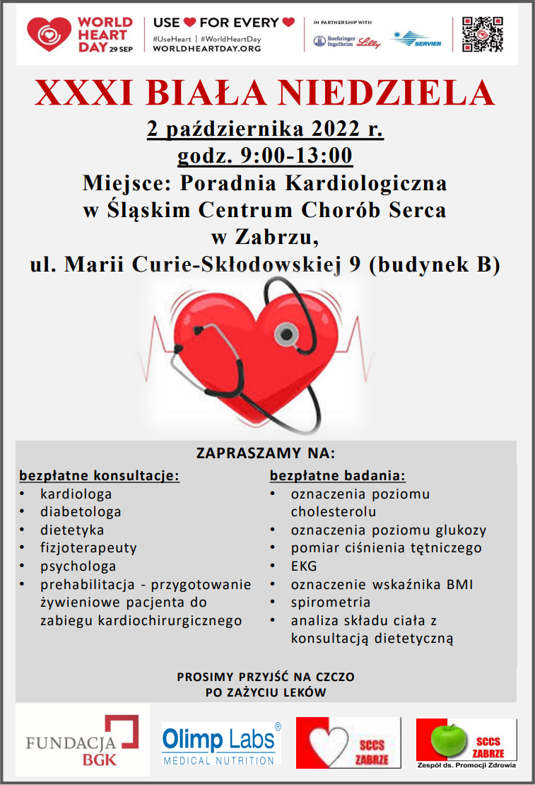 Śląskie Centrum Chorób Serca w Zabrzu zaprasza na akcję edukacyjno-zdrowotną tzw. Białą Niedzielę, której celem jest zachęcenie społeczeństwa do prowadzenia zdrowego, przyjaznego sercu życia.