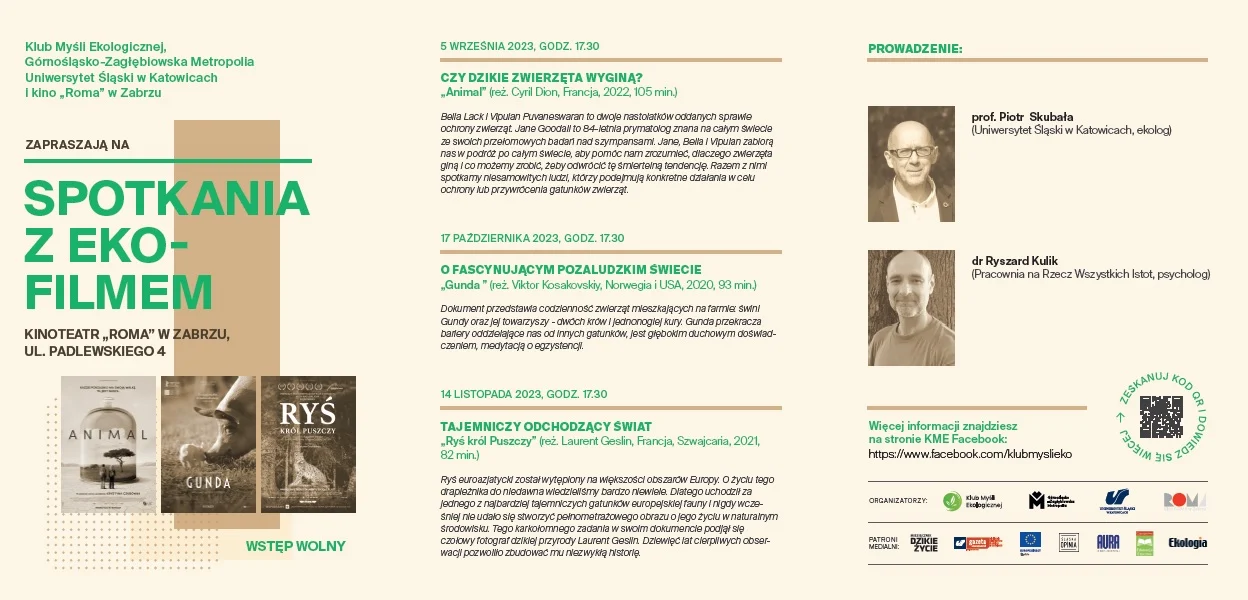 Klub Myśli Ekologicznej prowadzi działalność z zakresu ochrony środowiska zmierzającą do wzrostu wiedzy i świadomości ekologicznej mieszkańców Śląska i całej Polski, a także zmiany ich postaw na bardziej proekologiczne. W ramach tych działań w zabrzańskim Kinie „ Roma” odbędą się projekcje trzech filmów połączone ze spotkaniem i dyskusją z zaproszonymi gośćmi: prof. Piotrem Skubałą ekologiem z Uniwersytetu Sląskiego w Katowicach oraz dr Ryszard Kulik psycholog z Pracowni na Rzecz Wszystkich Istot.