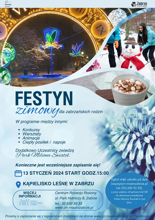 Centrum Rozwoju Rodziny zaprasza zabrzańskie rodziny do udziału w Festynie Zimowym, który odbędzie się 13 stycznia na terenie Kąpieliska Leśnego. Tego dnia od godziny 15.00 na uczestników będzie czekała moc atrakcji – animacje, zabawy oraz możliwość zwiedzenia Parku Miliona Świateł. Na wydarzenie obowiązują zapisy, które potrwają do 9 stycznia. Ilość miejsc jest ograniczona, a decyduje kolejność zgłoszeń.