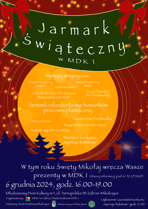 Młodzieżowy Dom Kultury nr 1 w Zabrzu-Mikulczycach zaprasza w najbliższy piątek 6 grudnia w godzinach od 16:00 do 19:00 na III Jarmark Świąteczno-Mikołajkowy, ul. Tarnopolska 50.