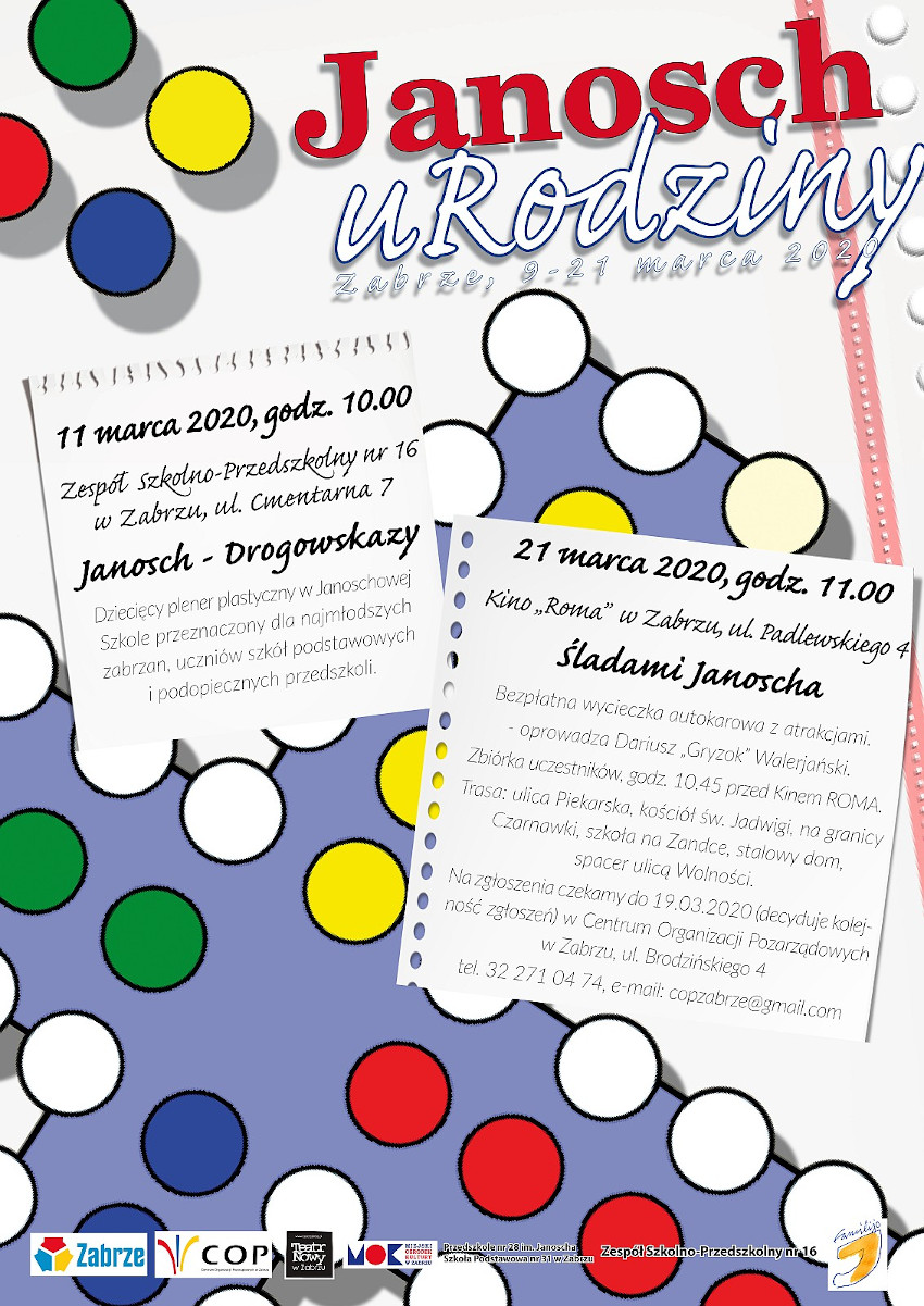 W Zespole Szkolno-Przedszkolnym nr 16 w Zabrzu przy ul. Cmentarnej 7 odbędzie się dziecięcy plener plastyczny „Janosch – Drogowskazy”, który będzie inspirowany dziełami popularnego autora.