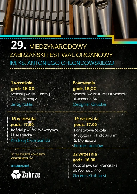 Międzynarodowy Zabrzański Festiwal Organowy im. ks. Antoniego Chlondowskiego to prawdziwa uczta dla melomanów. Organizatorem tego wyjątkowego wydarzenia artystycznego jest Miasto Zabrze. Festiwal ten, poświęcony muzyce organowej, gromadzi wybitnych artystów z Polski i zagranicy, którzy prezentują szeroki repertuar muzyki organowej, od klasycznych dzieł po współczesne kompozycje.