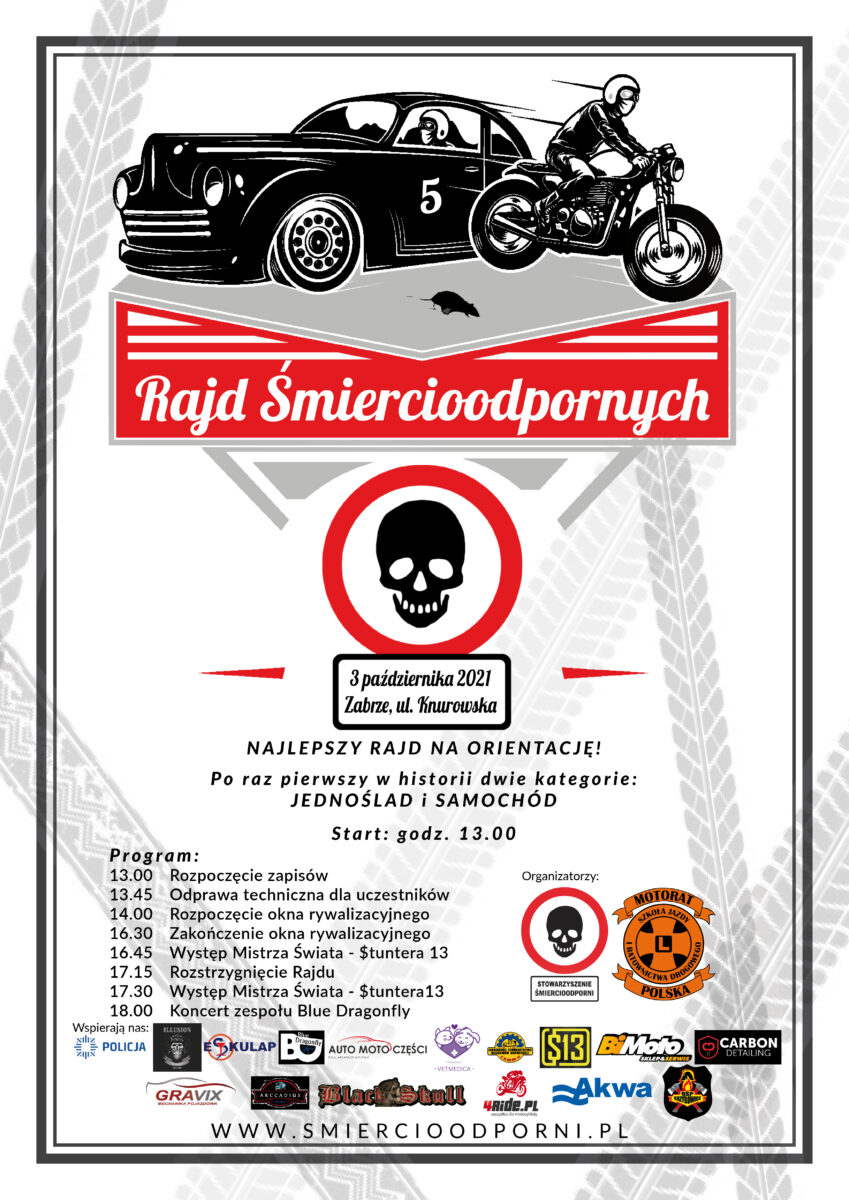 Fantastyczna atmosfera, cały dzień niesamowitych, motoryzacyjnych atrakcji, imponująca trasa turystyczno-rywalizacyjna wytyczona po całym Zabrzu, rywalizacja z innymi zmotoryzowanymi, ale także z własnymi słabościami – to tylko część atrakcji, jakie przygotowali organizatorzy piątej edycji Rajdu Śmiercioodpornych – Stowarzyszenie Śmiercioodporni we współpracy ze Szkołą Jazdy i Ratownictwa Drogowego MotoRat. Impreza rozpocznie się 3 października o godz. 12.00 na placu manewrowym MotoRat przy ul. Knurowskiej w Zabrzu.