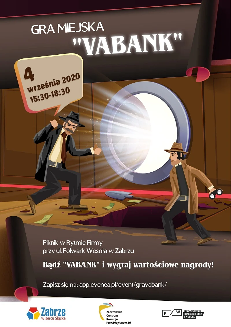 Osoby chętne do udziału w grze miejskiej „Vabank” prosi się o zgłoszenie do rejestracji podczas Pikniku w Rytmie Firmy w punkcie Zabrzańskiego Centrum Rozwoju Przedsiębiorczości.