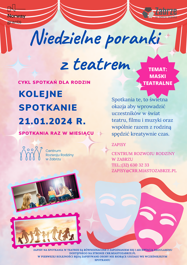 Centrum Rozwoju Rodziny w Zabrzu zaprasza do zapisów i wzięcia aktywnego udziału w kolejnej edycji “Niedzielnych poranków z teatrem”. Najbliższe spotkanie w ramach tego projektu zaplanowano 21 stycznia. Będzie to okazja by wspólnie ze swoimi bliskim spędzić kreatywnie czas.