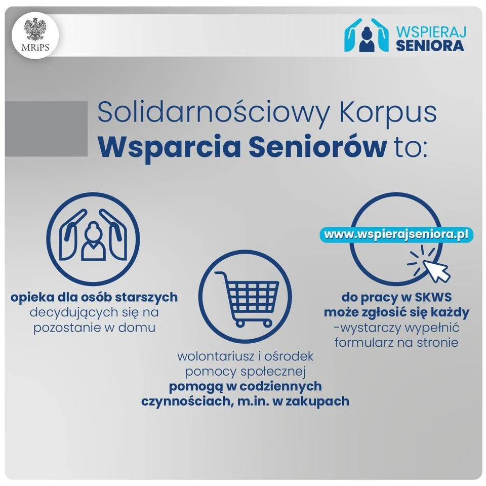 Celem programu „Wspieraj Seniora” jest zapewnienie usługi wsparcia Seniorów w wieku 70 lat i więcej, którzy w obowiązującym stanie epidemii zdecydują się na pozostanie w domu i nie są w stanie np. poprzez wsparcie rodziny zabezpieczyć sobie artykułów podstawowej potrzeby. Usługa wsparcia będzie polegała w szczególności na dostarczeniu zakupów obejmujących artykuły podstawowej potrzeby, w tym artykuły spożywcze, środki higieny osobistej.