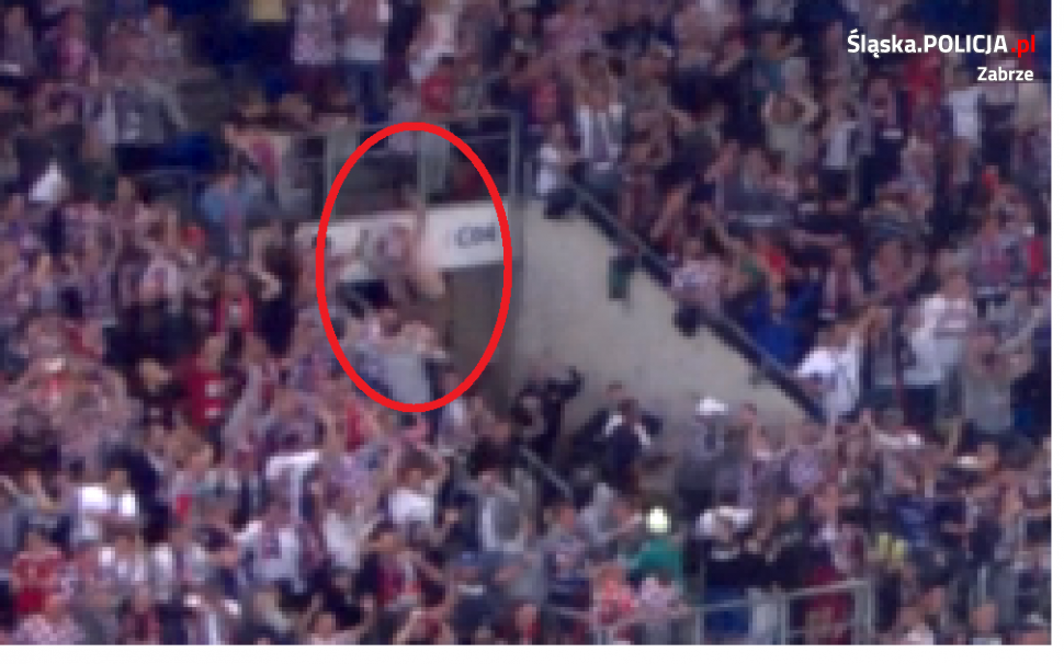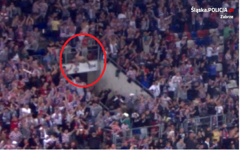 Do zdarzenia doszło podczas meczu piłki nożnej pierwszej rundy eliminacji do Ligi Europy, gdzie Górnik Zabrze podejmował mołdawską drużynę Zarea Bielce. Z policyjnych ustaleń wynika, że do upadku z wysokości ok 3,5 m do przejścia między trybunami doszło w 89 minucie gry. 26-letni kibic zabrzańskiej drużyny z urazem głowy i twarzy został przetransportowany do szpitala, gdzie przeszedł operację. Rannemu pobrano również krew do badań. Okazało się, że mężczyzna był nietrzeźwy. Badanie wskazało, że miał w organizmie 2,5 promila alkoholu. Czynności w tej sprawie trwają.