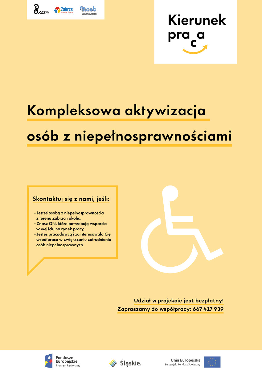Miasto Zabrze przystąpiło do Projektu „Kierunek Praca” jako Partner. Liderem projektu jest Forum Organizacji Pozarządowych Działających na rzecz Osób Niepełnosprawnych, Chorych i ich Rodzin „RAZEM”. Projekt realizowany jest w ramach Działania 9.1 Aktywna Integracja Poddziałanie 9.1.5 Programy aktywnej integracji osób i grup zagrożonych wykluczeniem społecznym Regionalnego Programu Operacyjnego Województwa Śląskiego na lata 2014-2020. Ma na celu zwiększenie aktywności zawodowej 50 osób niepełnosprawnych z woj. śląskiego, szczególnie z Zabrza i okolic, poprzez realizację kompleksowego programu aktywizacji zawodowej.