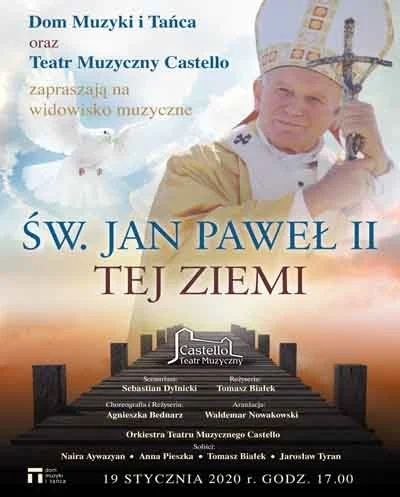 Wszystkie prezentowane dotąd produkcje teatru zostały entuzjastycznie przyjęte przez widzów, którzy za każdym razem wypełniali po brzegi widownię Domu Muzyki i Tańca.Widowisko przygotowane z wielkim rozmachem i w imponującej palecie form przekazu ma na celu przybliżyć życie wielkiego Polaka. Wybitni artyści scen muzycznych i tanecznych wrazz publicznością będą celebrować to wielkie święto. Poprzez taniec i śpiew artyści przeprowadzą widzów przez najważniejsze wydarzenia w życiu św. Jana Pawła II. Zabrzmią doskonale znane publiczności pieśni takie jak: „Barka”, „Abba Ojcze”, czy hymn Światowych Dni Młodzieży „Błogosławieni miłosierni”. Wszystkie utwory ubrane są w bogate aranżacje instrumentalne, które wykona orkiestra Teatru Muzycznego Castello. Zapraszamy na prawdziwą ucztę duchową, podczas której nie zabraknie pięknych wspomnień i niezapomnianych wzruszeń! Bilety zakupione na 13.10 zachowują ważność.