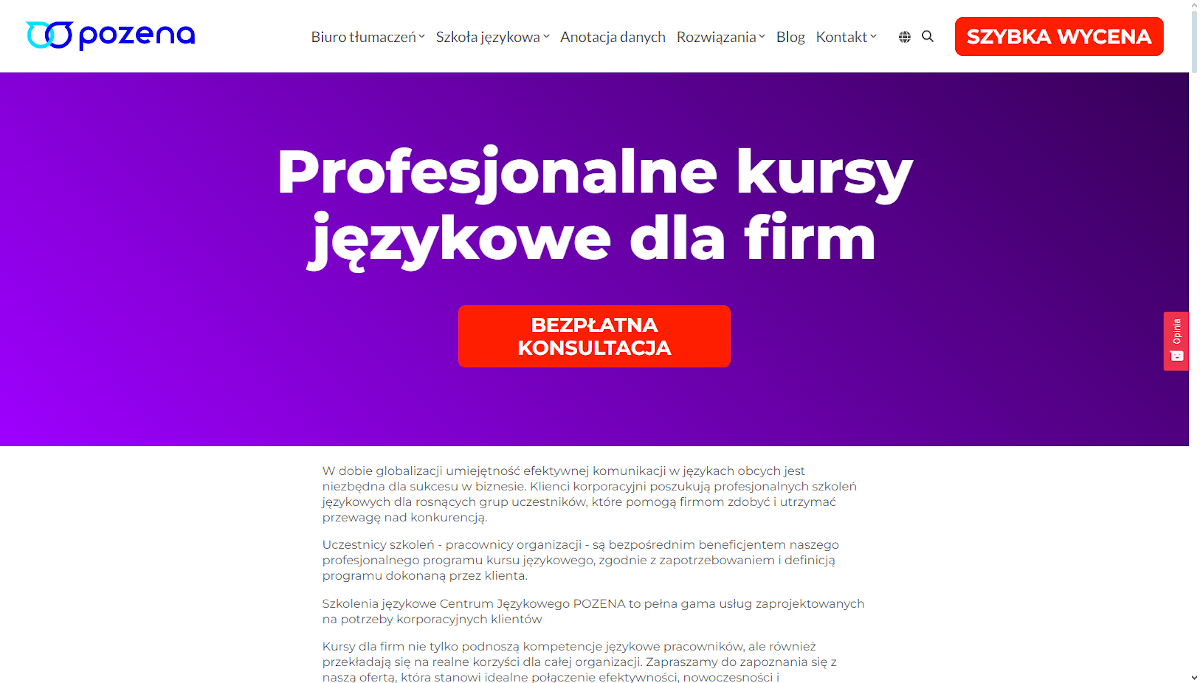 Profesjonalne szkolenia językowe dla firm ma do zaoferowania Biuro tłumaczeń POZENA – szkolenia językowe dla firm. Wieloletnie doświadczenie, nastawienie na zaspokajanie indywidualnych potrzeb kursantów, profesjonalne podejście profesjonalnej kadry oraz wartościowe materiały dydaktyczne sprawiają, że szkolenia języka dla firm online cieszą się dużym zainteresowaniem. Oferta obejmuje: